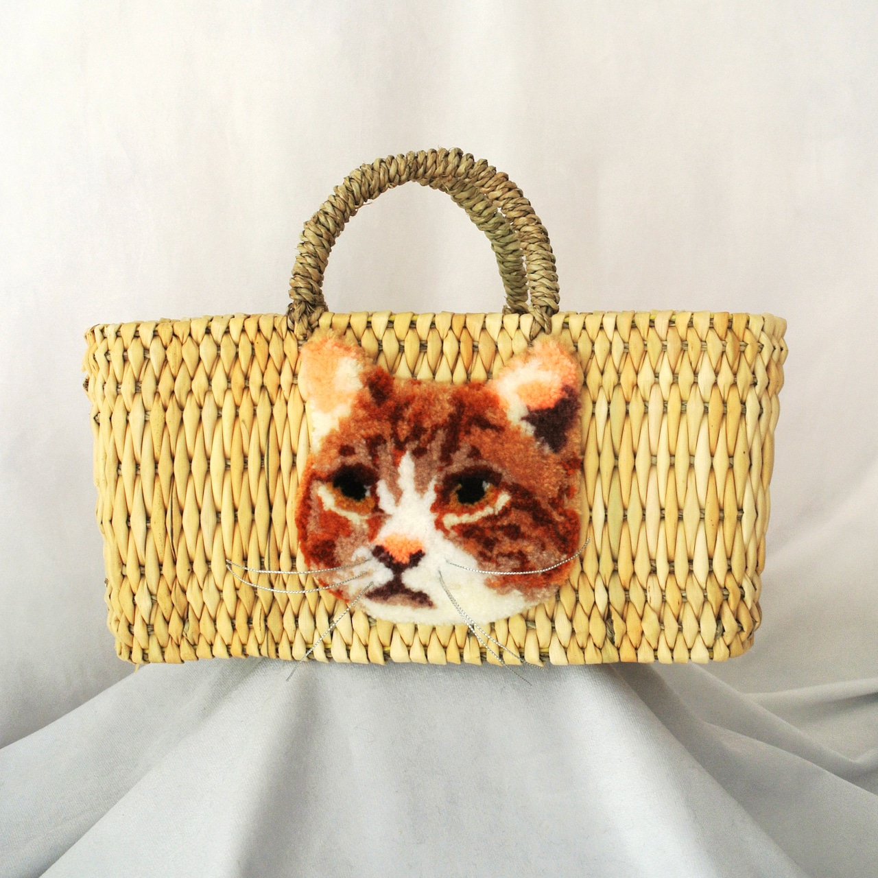 素朴な風合いのモロッコ製の、ストロー状の水草で編んだかごに、毛糸でモコモコに刺繍したネコを縫い付けました。