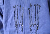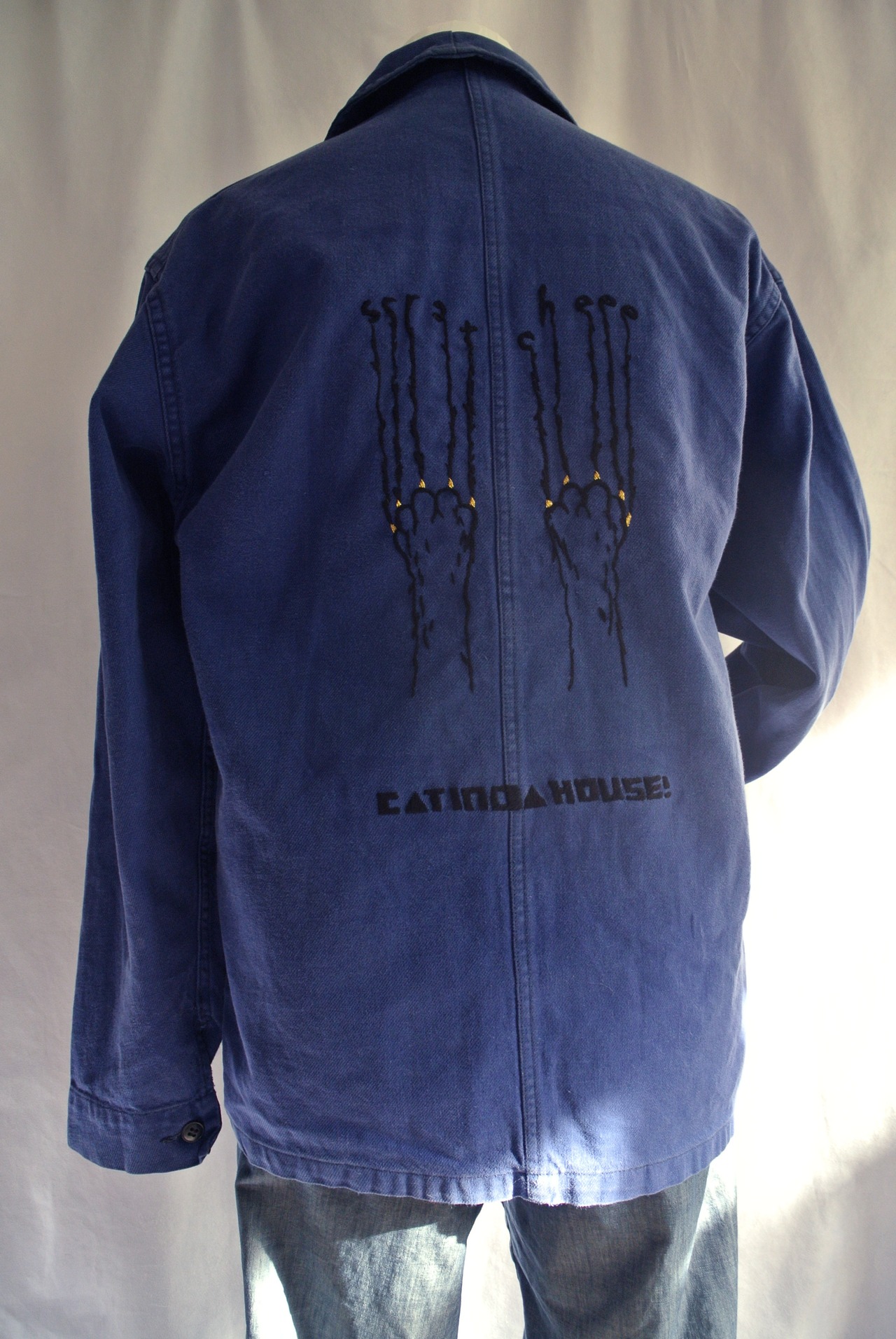 ヨーロッパ古着のワークジャケットに、手刺繍した青猫シリーズ。