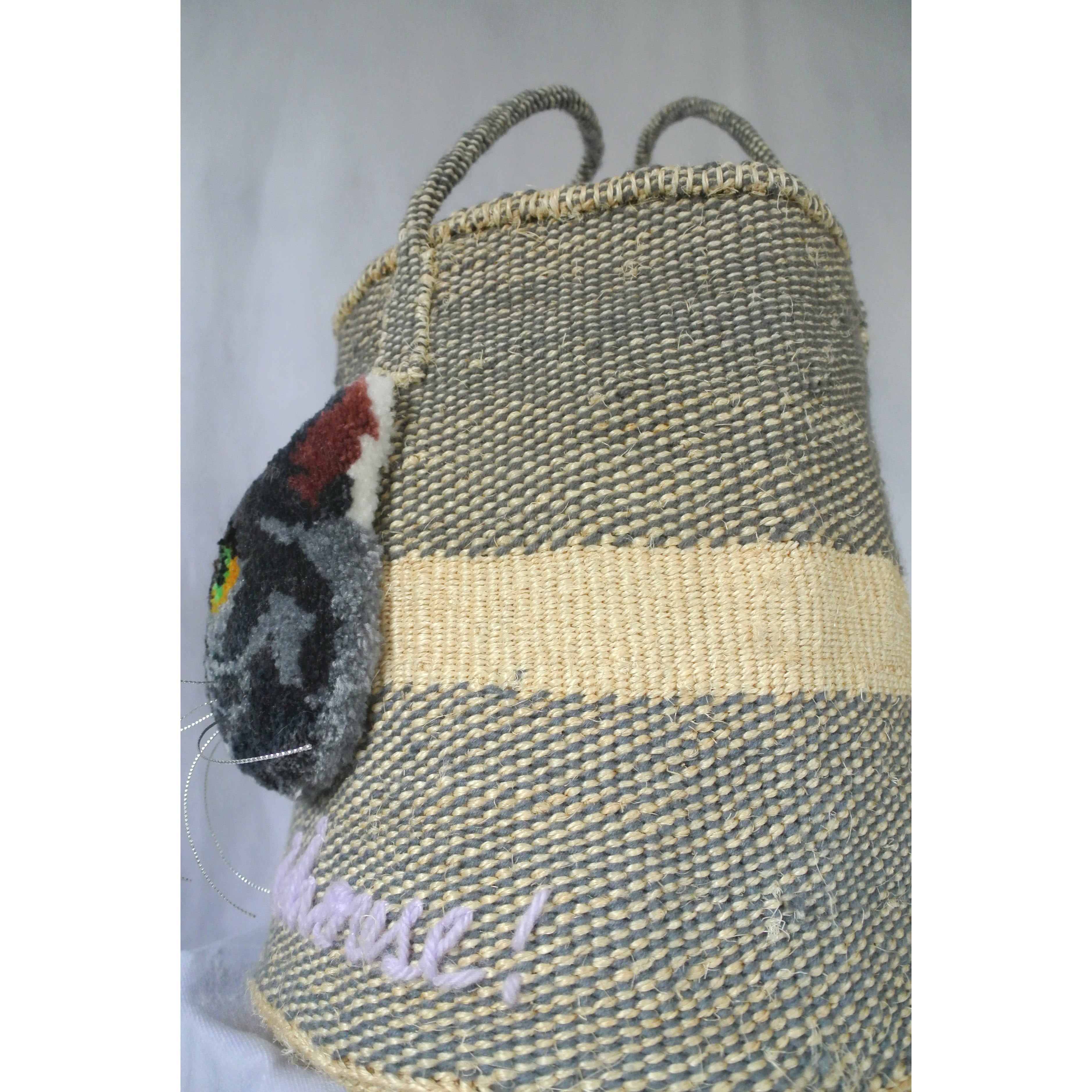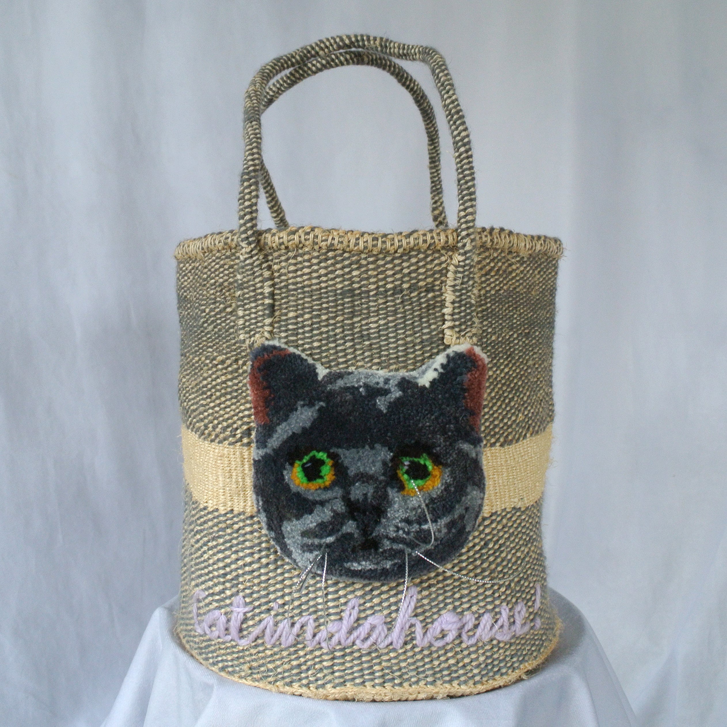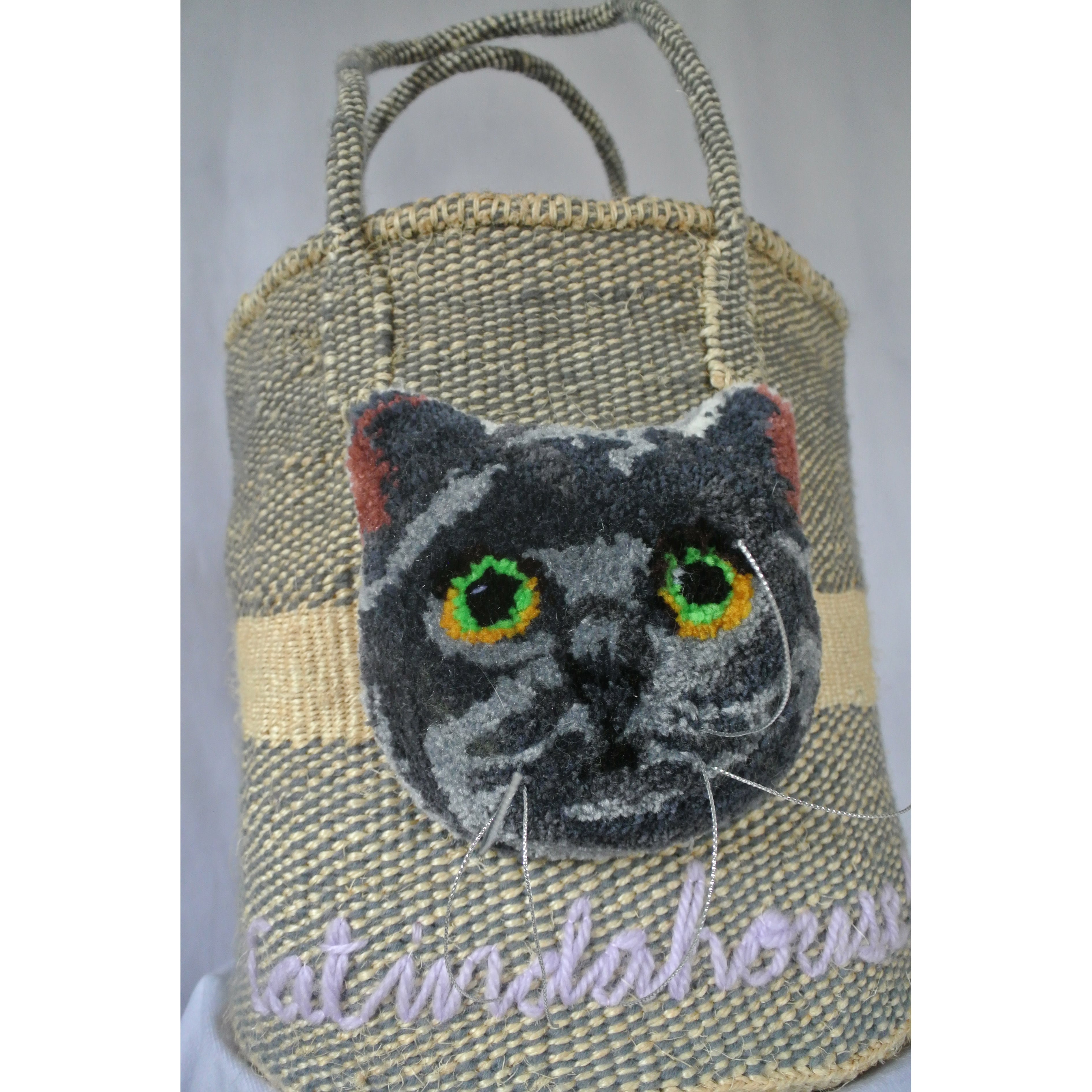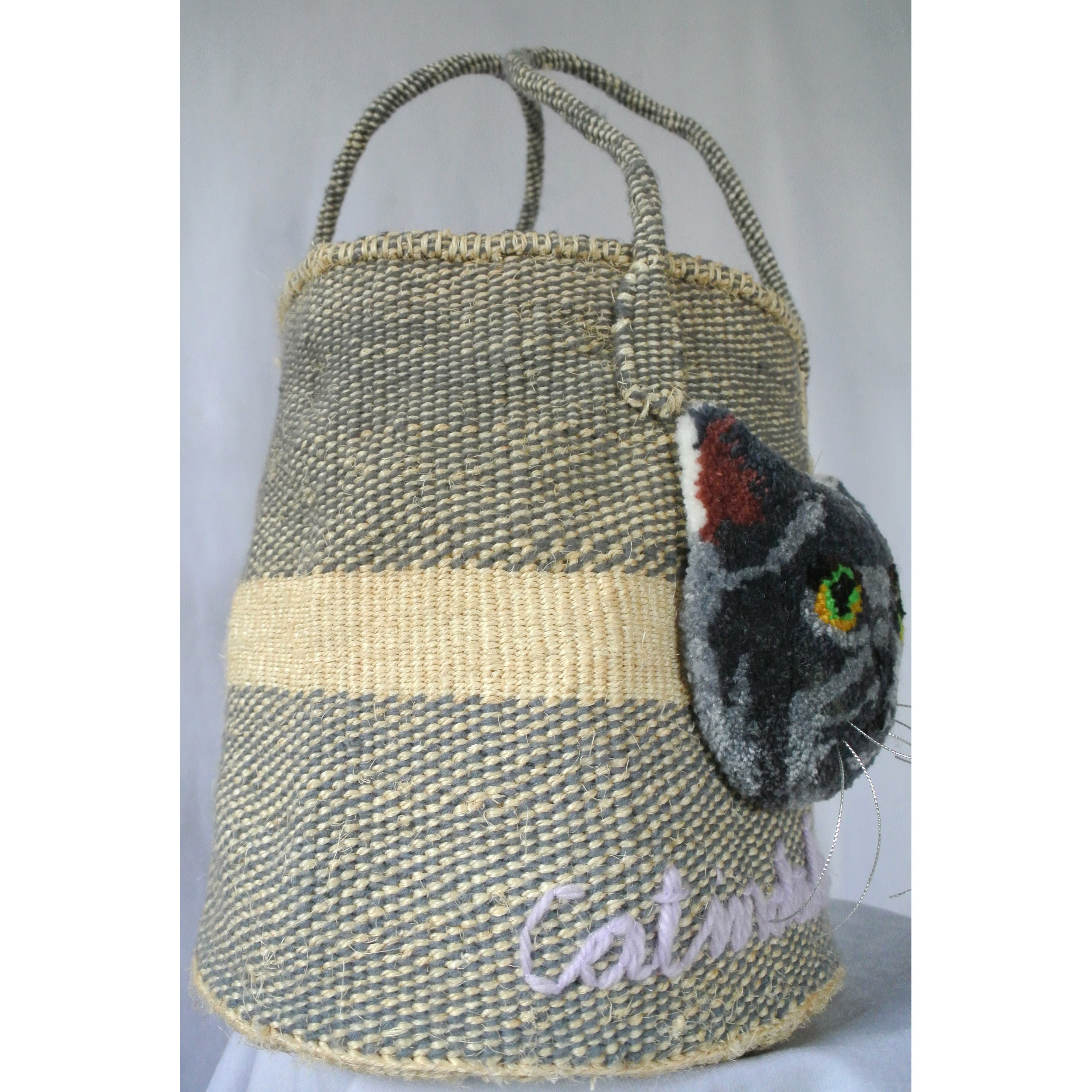 素朴な風合いのサイザルかごに、毛糸でモコモコに刺繍したcat faceを縫い付けました。