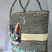 素朴な風合いのサイザルかごに、毛糸でモコモコに刺繍したcat faceを縫い付けました。